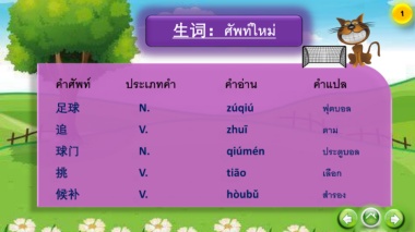 1 生词:ศัพท์ใหม่ ค าศัพท์ ประเภทค า ค าอ่าน ค าแปล 足球 N. zúqiú ฟุตบอล 追 V. zhuī ตาม 球门 N. qiúmén ประตูบอล 挑 V. tiāo เลือก 候补 V. hòubǔ ส ารอง