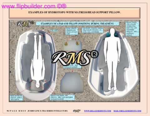 www.flipbuilder.com ©® www.flipbuilder.com ©® EXAMPLES OF HYDROTOP® WITH MATRESS/HEAD SUPPORT PILLOW. 96 | P A G E R M S ® JUMBO LINE X-TRA SERIES INTELLI-TUB®. WWW.RELAXMEDSYST.COM MAIL@RELAXMEDSYST.COM