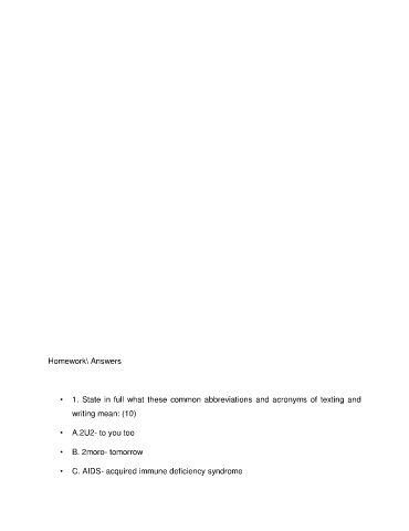 Homework\ Answers • 1. State in full what these common abbreviations and acronyms of texting and writing mean: (10) • A.2U2- to you too • B. 2moro- tomorrow • C. AIDS- acquired immune deficiency syndrome