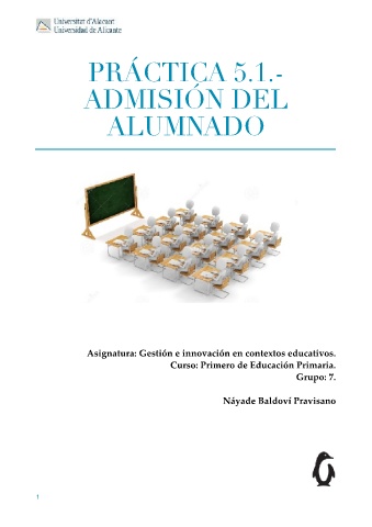 PRÁCTICA 5.1.- ADMISIÓN DEL ALUMNADO Asignatura: Gestión e innovación en contextos educativos. Curso: Primero de Educación Primaria. Grupo: 7. Náyade Baldoví Pravisano !1