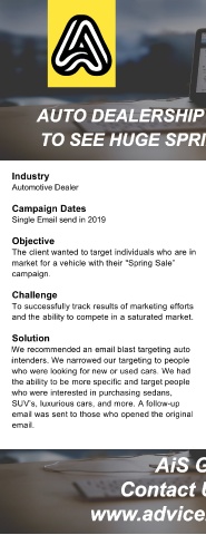 We recommended an email blast targeting auto auto dealers CPA by over 25%! The email