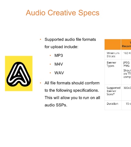 Audio Creative Specs • Supported audio file formats for upload include: • MP3 • M4V • WAV • All file formats should conform to the following specifications. This will allow you to run on all audio SSPs.