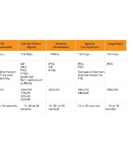 Audio Creative Specs • Supported audio file formats for upload include: • MP3 • M4V • WAV • All file formats should conform to the following specifications. This will allow you to run on all audio SSPs.