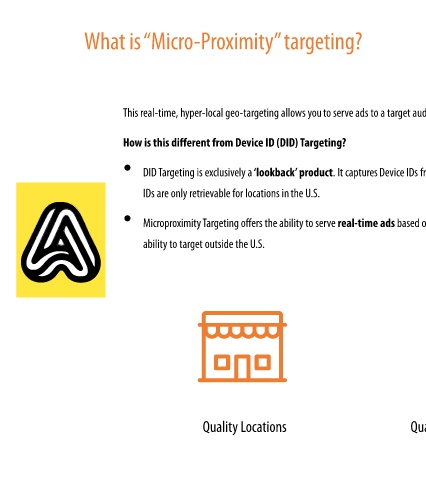 • MicroproximityTargeting offers the ability to serve real-time ads based on a location of any device within a defined 100-1000meter proximity or fence. It also offers the