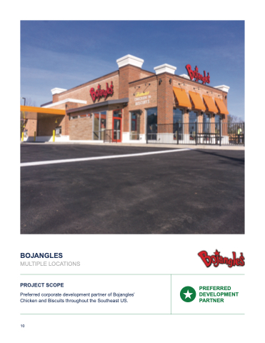 BOJANGLES MULTIPLE LOCATIONS PROJECT SCOPE Preferred corporate development partner of Bojangles’ Chicken and Biscuits throughout the Southeast US. PREFERRED DEVELOPMENT PARTNER 10