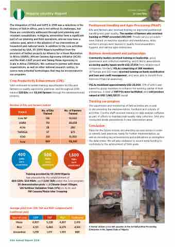 The integration of SAA and SAFE in 2018 was a milestone in the history of SAA in Africa, and is not without its challenges, but these are consistently addressed through joint planning and constant consultations. In Nigeria, universities form a signi cant part of our planning and eld operations, and we now have a cohesive goal, which is the adoption of our interventions at household and national levels. In addition to the core activities conducted by SAA, SG 2000 Nigeria bene tted from the provision of further projects by Alliance for a Green Revolution in Africa (AGRA), African Cassava Agronomy Initiative (ACAI) and the IFAD-CASP project and Taking Maize Agronomy to Scale in Africa (TAMASA). We continue to partner with these organizations, as well as other national research centres, to source new potential technologies that may be incorporated in our programs.