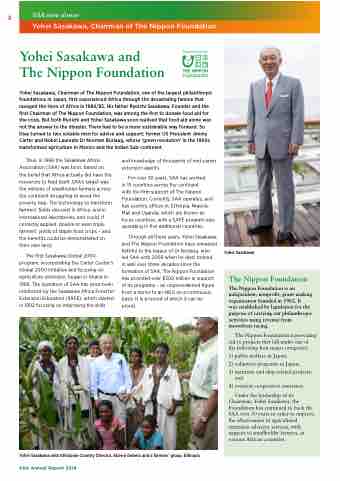 Yohei Sasakawa, Chairman of The Nippon Foundation, one of the largest philanthropic foundations in Japan, rst experienced Africa through the devastating famine that ravaged the Horn of Africa in 1984/85. His father Ryoichi Sasakawa, Founder and the rst Chairman of The Nippon Foundation, was among the rst to donate food aid for the crisis. But both Ryoichi and Yohei Sasakawa soon realised that food aid alone was not the answer to the disaster. There had to be a more sustainable way forward. So they turned to two notable men for advice and support: former US President Jimmy Carter and Nobel Laureate Dr Norman Borlaug, whose ‘green revolution’ in the 1960s transformed agriculture in Mexico and the Indian Sub-continent.