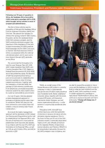 The rst of these reforms was the integration of SAA and the Sasakawa Africa Fund for Extension Education (SAFE) into One SAA. This allowed the operation to enhance the synergy between SAA Country Programs; namely the Sasakawa Global 2000 eld extension program, and the SAFE university extension program. Key objectives of the integration of One SAA include incorporating SG 2000 practical eld knowledge into the SAFE curriculum, so that the SAA eld extension method