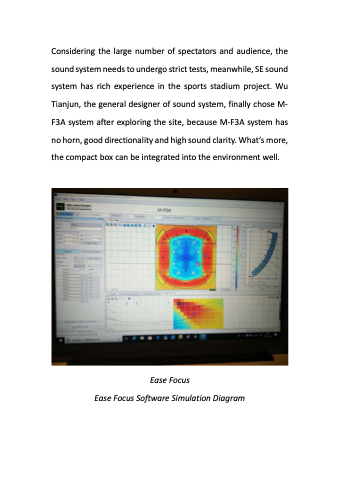 Considering the large number of spectators and audience, the sound system needs to undergo strict tests, meanwhile, SE sound system has rich experience in the sports stadium project. Wu Tianjun, the general designer of sound system, finally chose M- F3A system after exploring the site, because M-F3A system has no horn, good directionality and high sound clarity. What’s more, the compact box can be integrated into the environment well.