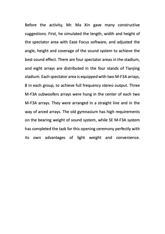 Before the activity, Mr. Ma Xin gave many constructive suggestions. First, he simulated the length, width and height of the spectator area with Ease Focus software, and adjusted the angle, height and coverage of the sound system to achieve the best sound effect. There are four spectator areas in the stadium, and eight arrays are distributed in the four stands of Tianjing stadium. Each spectator area is equipped with two M-F3A arrays, 8 in each group, to achieve full frequency stereo output. Three M-F3A subwoofers arrays were hung in the center of each two M-F3A arrays. They were arranged in a straight line and in the way of arced arrays. The old gymnasium has high requirements on the bearing weight of sound system, while SE M-F3A system has completed the task for this opening ceremony perfectly with its own advantages of light weight and convenience.