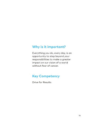 Why is it important? Everything you do, every day, is an opportunity to step beyond your responsibilities to make a greater impact on our vision of a world without fear of cancer. Key Competency Drive for Results 56