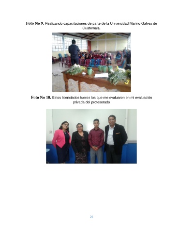 Foto No 9. Realizando capacitaciones de parte de la Universidad Marino Gálvez de Guatemala. Foto No 10. Estos licenciados fueron los que me evaluaron en mi evaluación privada del profesorado 26