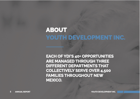 ABOUT YOUTH DEVELOPMENT INC EACH OF YDI’S 40+ OPPORTUNITIES ARE MANAGED THROUGH THREE DIFFERENT DEPARTMENTS THAT COLLECTIVELY SERVE OVER 4 500 FAMILIES THROUGHOUT NEW MEXICO 5 ANNUAL REPORT YOUTH DEVELOPMENT INC