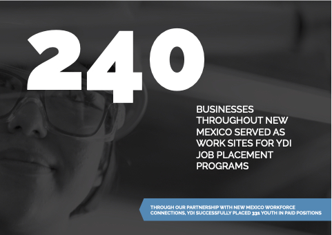 BUSINESSES THROUGHOUT NEW MEXICO SERVED AS WORK SITES FOR YDI JOB PLACEMENT PROGRAMS THROUGH OUR PARTNERSHIP WITH NEW MEXICO WORKFORCE CONNECTIONS YDI SUCCESSFULLY PLACED 331 YOUTH IN PAID POSITIONS