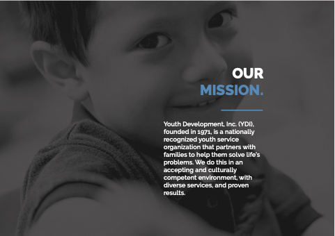 MISSION Youth Development Inc (YDI) founded in 1971 is a a a nationally recognized youth service organization that partners with families to help them solve life’s problems We do this in an accepting and culturally competent environment with diverse services and proven results
