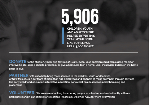 DONATE to to to the the the children youth and families of New Mexico Your donation could help a a a a a a a a a gang member improve his life send a a a a child to to preschool or give a a a a homeless teen a a a a home home home Click the the Donate button on on on the the home home home page to give PARTNER with us to to to help bring more more services to to to the children youth and and families of of New Mexico Join our team of of more than 500 employees and partners to make an an an impact through services like early childhood edcuation alternative education behavioral health services and and job training and and placement VOLUNTEER We are always looking for amazing people to volunteer and work directly with our participants and in in in our administartive offices Please call (505) 352-3444 for for more information