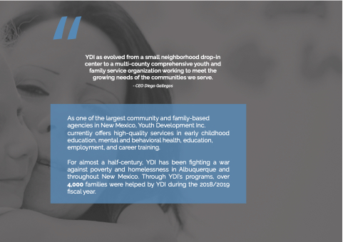 As one of the largest community and family-based agencies in New Mexico Youth Development Inc currently offers high-quality services in early childhood education education mental and behavioral health education education employment and career training For almost a a a a a a half-century YDI has been fighting a a a a a a war against poverty and and homelessness in in Albuquerque and and throughout New Mexico Through YDI’s programs over 4 000 families were helped by YDI during the 2018/2019 fiscal year