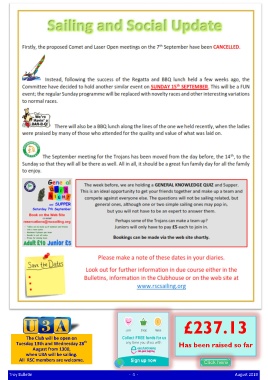 £237.13 The Club will be open on Tuesday 13th and Wednesday 28 th Has been raised so far August from 1300, when U3A will be sailing. All RSC members are welcome. Troy Bulletin - 4 - August 2019