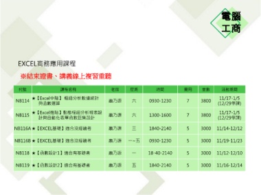 NB116B ★【EXCEL基礎】適合沒經驗者 蕭乃源 一~五 0930-1230 5 3000 11/19-11/23