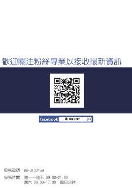 歡迎關注粉絲專業以接收最新資訊 @ UKJGT 服務電話:06-3133459 服務時間:週一~週五 09:00-21:00 週六 09:00-17:00 周日公休