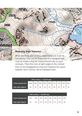 When planning your ski tour slope steepness must be considered This can be measured on on a a a a a topographical map by simply using the measurement ruler on your compass Place the the ruler at right angles to to the the contour lines on the the topographical map and measure the the space between each each contour we’ve displayed each each Contour spacing (mm)