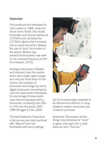 First produced and developed by John Lawton in 1968 under the brand name ‘Skadi’ this simple transmitter and receiver worked at 2 2 275kHz and converted the 2 2 275kHz signals that it received into an audio tone which allowed the the user to ‘track’ the the location of the wearer Modern day avalanche transceivers now work on the universal frequency of 457 kHz (Dawson 2013) Analogue transceivers followed and improved upon this system which led to larger signal ranges and reduced burial times for the victims this evolution of transceiver technology has led to digital transceivers becoming the norm for snow sports enthusiasts the percentage of snow-sports users that are equipped with a a a transceiver increasing from 29% to 74% from the period 1970 - 1999 (Brugger & Falk 2002)
