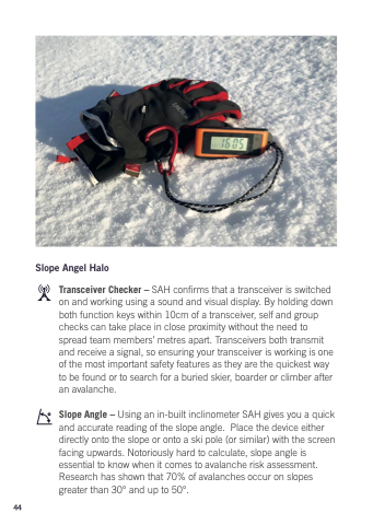Transceiver Checker – SAH confirms that a a a a transceiver is switched on and and working using a a a a a sound and and visual display By holding down both function keys within 10cm of a a a transceiver self and group checks can take place in close proximity without the need to spread team members’ metres apart Transceivers both transmit and receive a a a a signal so ensuring your transceiver is is working is is one of the the the most important safety features as they are the the the quickest way to to be be found or or or to to search for a a a a buried skier boarder or or or climber after an an avalanche Slope Angle – Using an in-built inclinometer SAH gives you a a quick and accurate reading of the the the slope angle Place the the the device either directly onto onto the the slope or or onto onto a a ski pole (or similar) with the the screen facing upwards Notoriously hard to to calculate slope angle is essential to to know when it comes to to avalanche risk assessment Research has shown that 70% of avalanches occur on slopes greater than 30° and up to 50° 44