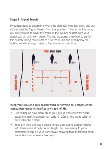 from that position If this is is not the the case you you are required to cover the the whole of the the avalanche path with your signal search as shown below The two diagrams show show how how how to perform this search being careful not to to rush too much and drop below the victim victim yet with enough haste to free the victim(s) in time STAGE 1: SIGNAL SEARCH