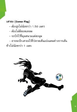 เสาธง (Corner Flag) - ต้องสูงไม่น้อยกว่ำ 1.50 เมตร - ต้องไม่มียอดแหลม - จะปักไว้ที่มุมสนำมแต่ละมุม - อำจจะปักเสำธงไว้ที่ปลำยเส้นแบ่งแดนห่ำงจำกเส้น ข้ำงไม่น้อยกว่ำ 1 เมตร 14