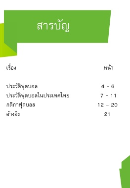 สำรบัญ เรื่อง หน้ำ ประวัติฟุตบอล 4 - 6 ประวัติฟุตบอลในประเทศไทย 7 - 11 กติกำฟุตบอล 12 – 20 อ้ำงอิง 21 3
