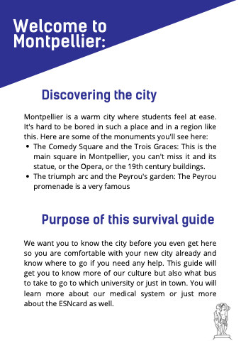 We want you to know the city before you even get here so you are comfortable with your new city already and know where to go if you need any help. This guide will get you to know more of our culture but also what bus to take to go to which university or just in town. You will learn more about our medical system or just more about the ESNcard as well.