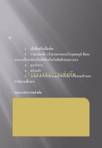 1. เสื้อยืดหรือเสื้อเชิ้ต 2. กางเกงขาสั้น (ถ้าสวมกางเกงปรับอุณหภูมิ สีของ กางเกงนั้นจะต้องเป็นสีเดียวกันกับสีหลักของกางเกง 3. ถุงเท้ายาว 4. สนับแข้ง 5. รองเท้าผ้าใบหรือรองเท้าหนังนิ่ม หรือรองเท้าออก ก าลังกายพื้นยาง ระยะเวลาการแข่งขัน