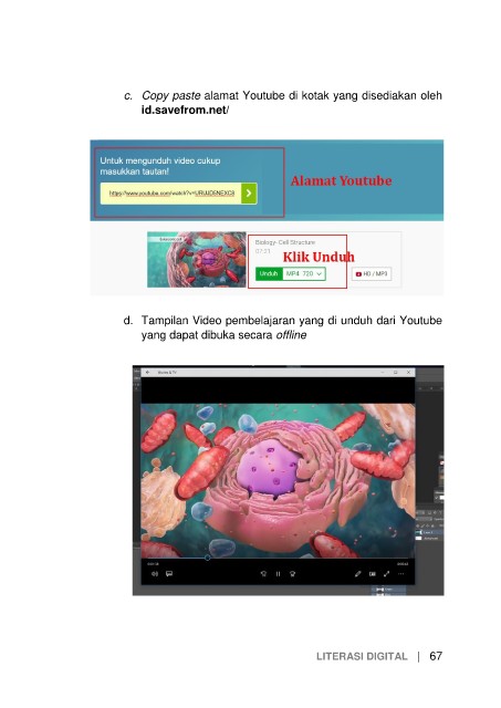 c. Copy paste alamat Youtube di kotak yang disediakan oleh id.savefrom.net/ d. Tampilan Video pembelajaran yang di unduh dari Youtube yang dapat dibuka secara offline LITERASI DIGITAL | 67