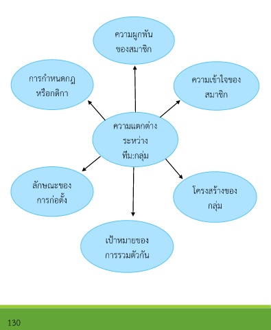ความผูกพัน ของสมาชิก การก าหนดกฎ ความเข้าใจของ หรือกติกา สมาชิก ความแตกต่าง ระหว่าง ทีม:กลุ่ม ลักษณะของ โครงสร้างของ การก่อตั้ง กลุ่ม เป้าหมายของ การรวมตัวกัน 130