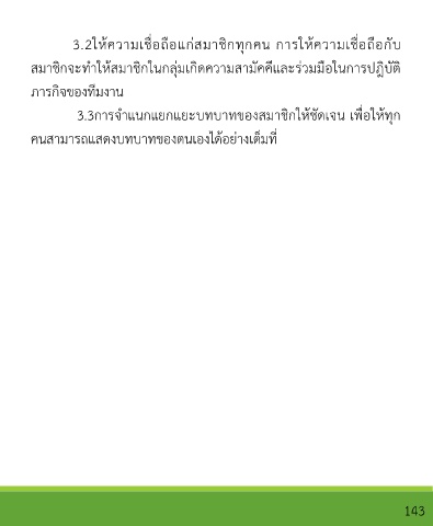 3.2ให้ความเชื่อถือแก่สมาชิกทุกคน การให้ความเชื่อถือกับ สมาชิกจะท าให้สมาชิกในกลุ่มเกิดความสามัคคีและร่วมมือในการปฎิบัติ ภารกิจของทีมงาน 3.3การจ าแนกแยกแยะบทบาทของสมาชิกให้ชัดเจน เพื่อให้ทุก คนสามารถแสดงบทบาทของตนเองได้อย่างเต็มที่ 143