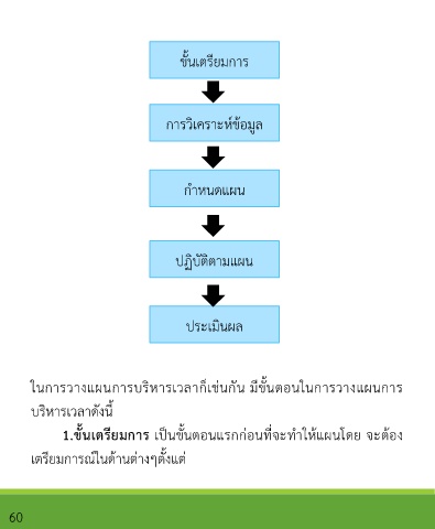 ขั้นเตรียมการ การวิเคราะห์ข้อมูล ก าหนดแผน ปฏิบัติตามแผน ประเมินผล ในการวางแผนการบริหารเวลาก็เช่นกัน มีขั้นตอนในการวางแผนการ บริหารเวลาดังนี้ 1.ขั้นเตรียมการ เป็นขั้นตอนแรกก่อนที่จะท าให้แผนโดย จะต้อง เตรียมการณ์ในด้านต่างๆตั้งแต่ 60
