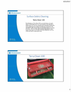 The Wiedenmann Terra Clean 100 is a ground driven unit towed behind a small utility vehicle. Its main purpose is the collection of surface debris by a counter rotational brush that deposits the debris onto an agitating screen to filter the infill back into the turf. The solid debris is then collected into two removable baskets at the rear of the unit. The Terra Clean 100 can also be equipped with rake fingers at the lower front of the unit for de-compaction and a rear follow up brush for surface grooming.