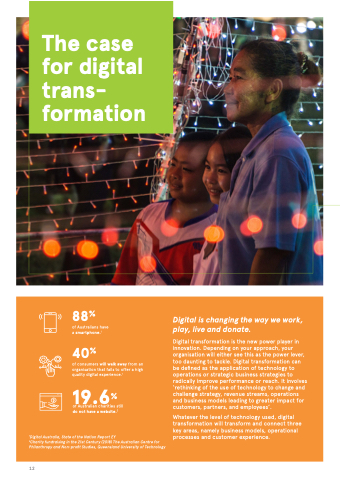 will transform transform and connect three key areas namely business models operational processes and customer experience of Australian charities still do not have a a a a a website 2 1Digital Australia State of the the Nation Report EY