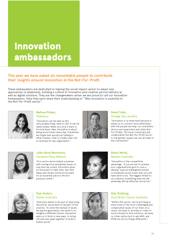 “As a a a a a sector we’ve tasked ourselves with solving local and global issues no no one else has solved Innovation gives us us the power to take risks test new ideas and remain solutions focused It’s an an essential piece in in the for- purpose toolkit ” Pam Anders Oxfam Australia