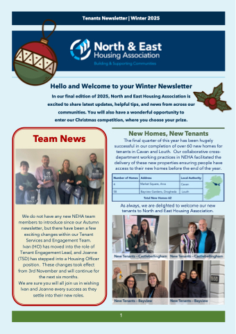 Tenants Newsletter | Winter 2025\u000A Hello and Welcome to your Winter Newsletter\u000AIn our final edition of 2025, North and East Housing Association is excited to share latest updates, helpful tips, and news from across our communities. You will also have a wonderful opportunity to enter our Christmas competition, where you choose your prize.\u000A Team News\u000ANew Homes, New Tenants\u000AThe final quarter of this year has been hugely successful in our completion of over 60 new homes for tenants in Cavan and Louth. Our collaborative cross- department working practices in NEHA facilitated the delivery of these new properties ensuring people have access to their new homes before the end of the year.\u000AAs always, we are delighted to welcome our new tenants to North and East Housing Association.\u000A We do not have any new NEHA team members to introduce since our Autumn newsletter, but there have been a few exciting changes within our Tenant Services and Engagement Team. Ivan (HO) has moved into the role of Tenant Engagement Lead, and Joanne (TSD) has stepped into a Housing Officer position. These changes took effect from 3rd November and will continue for the next six months.\u000AWe are sure you will all join us in wishing Ivan and Joanne every success as they settle into their new roles.\u000A 1\u000A