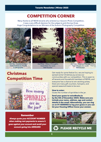 Tenants Newsletter | Winter 2025\u000A COMPETITION CORNER\u000AMany thanks to all NEHA tenants who entered our Autumn Photo Competition, it was a very difficult decision for the judges to pick the top three.\u000AHuge Congratulations to our Winners of the Autumn Photography Competition.\u000A Christmas Competition Time\u000AGet ready for some festive fun, we are hoping to spread some Christmas joy across our communities with our competition. This is open to all tenants and household members of NEHA, and everyone has a chance to win exciting prizes, there are many gift vouchers, hampers, and special seasonal treats to be won.\u000AHow to enter:\u000AGuess the number of sprinkles in the jar.\u000ASend your guess to voice@neha.ie\u000Aby the 5th of December 2025. Make sure you include your name, address, age and contact details in the email. Alternatively, you can ring us on 01-8200002 to log your guess or you can let your Housing Officer know your answer.\u000A Remember\u000AAlways quote your ACCOUNT NUMBER\u000Awhen making rent payments to ensure it goes against your account and avoid your account going into ARREARS!\u000A PLEASE RECYCLE ME\u000A 8\u000A