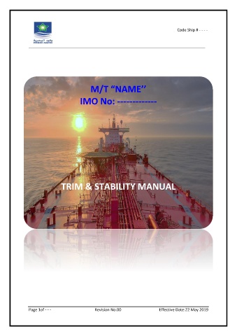 Code Ship # - - - - _________________________________________________________________________________ M/T “NAME’’ IMO No: ------------- TRIM & STABILITY MANUAL Page 1of - - - Revision No.00 Effective Date:22 May 2019
