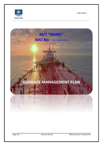 Code Ship # - - - - _________________________________________________________________________________ M/T “NAME’’ IMO No: ------------- GARBAGE MANAGEMENT PLAN Page 1of - - - Revision No.00 Effective Date:22 May 2019