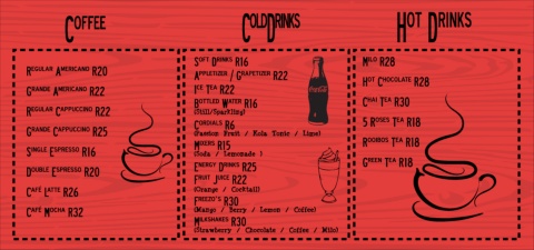 Grande Americano R22 Ice Tea R22 Hot Chocolate R28