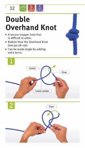 32 Double Overhand Knot A secure stopper knot that is difficult to untie. Bulkier than the Overhand Knot (see pp.28–29). Can be made larger by adding extra turns. Under Over Cross under Over