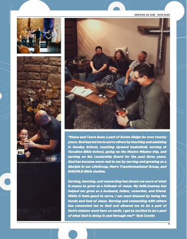 “Diane and I have been a part of Scioto Ridge for over twenty years. God has led me to serve others by teaching and assisting in Sunday School, coaching Upward basketball, serving at Vacation Bible School, going on the Mexico Mission trip, and serving on the Leadership Board for the past three years. God has become more real to me by serving and growing as a disciple in our LifeGroup, Men’s Transformational Group, and DISCIPLE Bible studies.