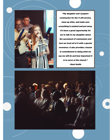 “My daughter and I prepare communion for the 11 AM service, clean up after, and make sure everything is washed and put away. It’s been a great opportunity for me to talk to my daughter about the sacrament of communion and how we treat all of it with a special reverence. It also provides a lesson in commitment to doing what we say we will do and how important it is to serve at the church.” -Staci Smith