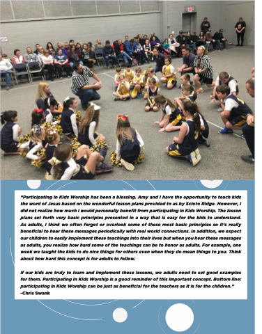 “Participating in Kids Worship has been a blessing. Amy and I have the opportunity to teach kids the word of Jesus based on the wonderful lesson plans provided to us by Scioto Ridge. However, I did not realize how much I would personally benefit from participating in Kids Worship. The lesson plans set forth very basic principles presented in a way that is easy for the kids to understand. As adults, I think we often forget or overlook some of these most basic principles so it’s really beneficial to hear these messages periodically with real world connections. In addition, we expect our children to easily implement these teachings into their lives but when you hear these messages as adults, you realize how hard some of the teachings can be to honor as adults. For example, one week we taught the kids to do nice things for others even when they do mean things to you. Think about how hard this concept is for adults to follow.