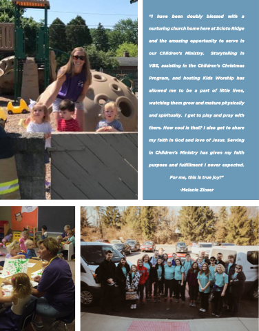 “I have been doubly blessed with a nurturing church home here at Scioto Ridge and the amazing opportunity to serve in our Children’s Ministry. Storytelling in VBS, assisting in the Children's Christmas Program, and hosting Kids Worship has allowed me to be a part of little lives, watching them grow and mature physically and spiritually. I get to play and pray with them. How cool is that? I also get to share my faith in God and love of Jesus. Serving in Children's Ministry has given my faith purpose and fulfillment I never expected. For me, this is true joy!”