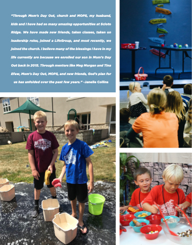 “Through Mom’s Day Out, church and MOPS, my husband, kids and I have had so many amazing opportunities at Scioto Ridge. We have made new friends, taken classes, taken on leadership roles, joined a LifeGroup, and most recently, we joined the church. I believe many of the blessings I have in my life currently are because we enrolled our son in Mom’s Day Out back in 2015. Through mentors like Meg Morgan and Tina Efaw, Mom’s Day Out, MOPS, and new friends, God’s plan for us has unfolded over the past few years.” -Janelle Collins
